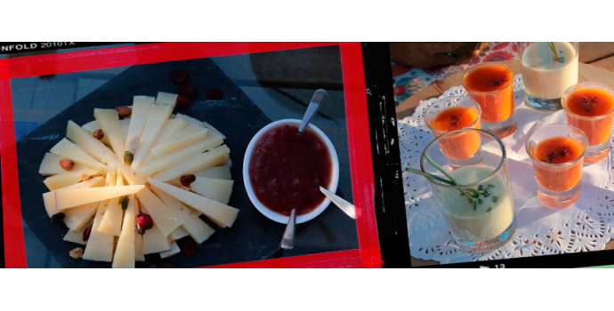 - Quesos gallegos con mermelada de tomate y crujiente de pan.